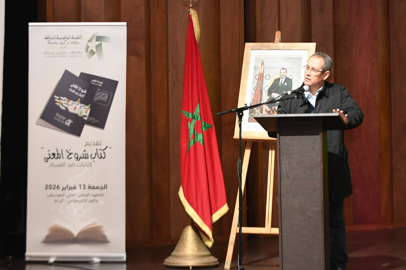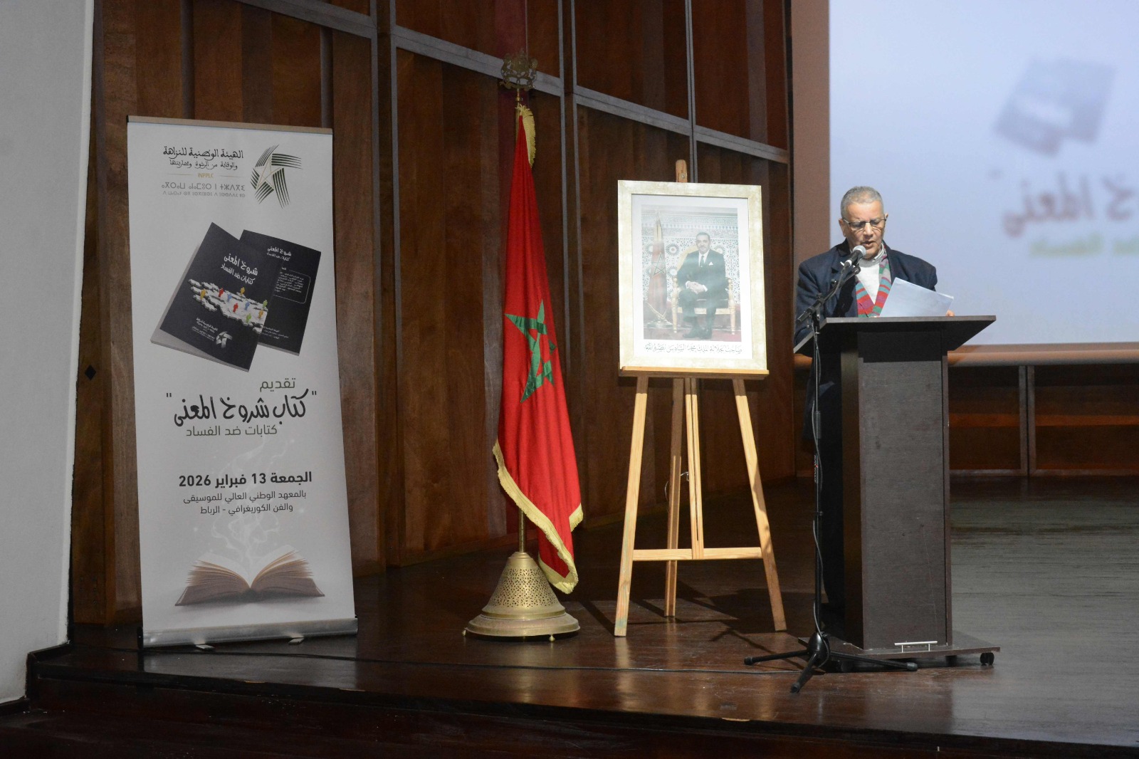 نظّمت الهيئة الوطنية للنزاهة والوقاية من الرشوة ومحاربتها يوم الجمعة 13 فبراير 2026، لقاءً ثقافياً وفكرياً، احتضنه المعهد الوطني العالي للموسيقى والفن الكوريغرافي بالرباط، بحضور نخبة من المثقفين والباحثين والمهتمين بقضايا الحكامة ومحاربة الفساد وتدبير الشأن العام، وذلك بمناسبة تقديم الكتاب الجماعي المعنون بـ "شروخ المعنى: كتابات ضد الفساد".